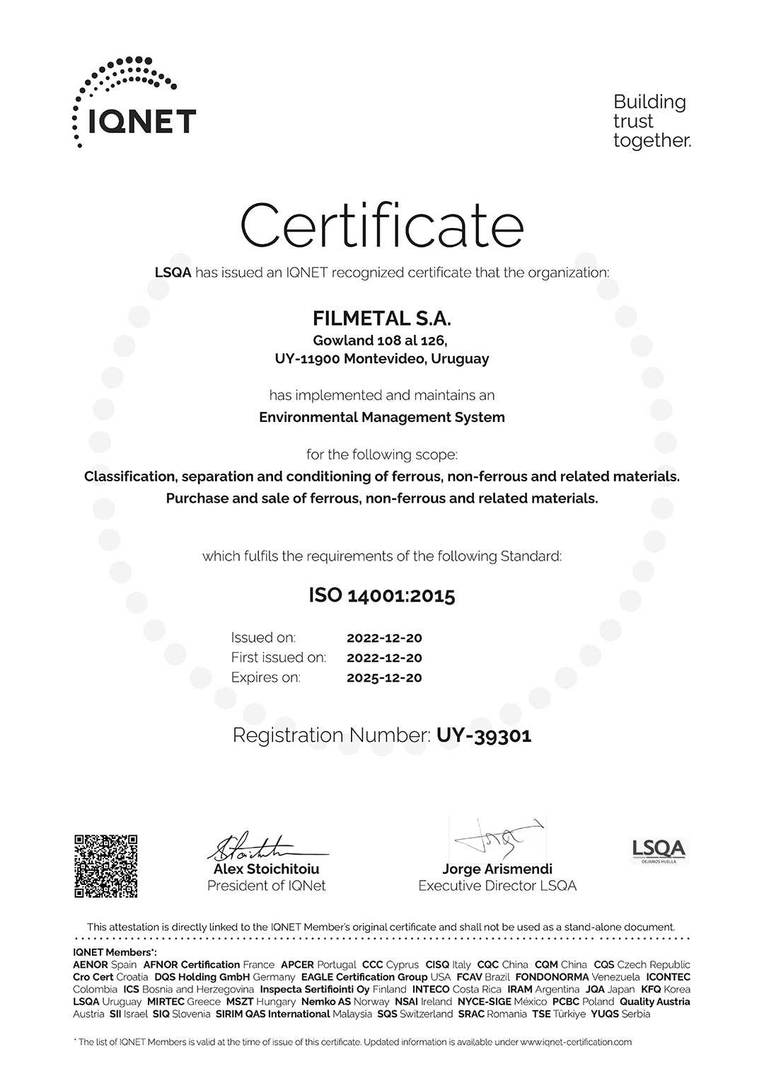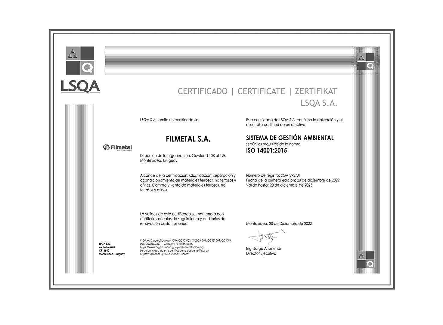 FILMETAL SA, empresa familiar dedicada a la gestión de materiales ferrosos, no ferrosos y afines, en el marco de la implementación de su sistema de gestión ambiental según norma ISO 14001:2015, consciente que sus actividades generan aspectos ambientales, se compromete a: